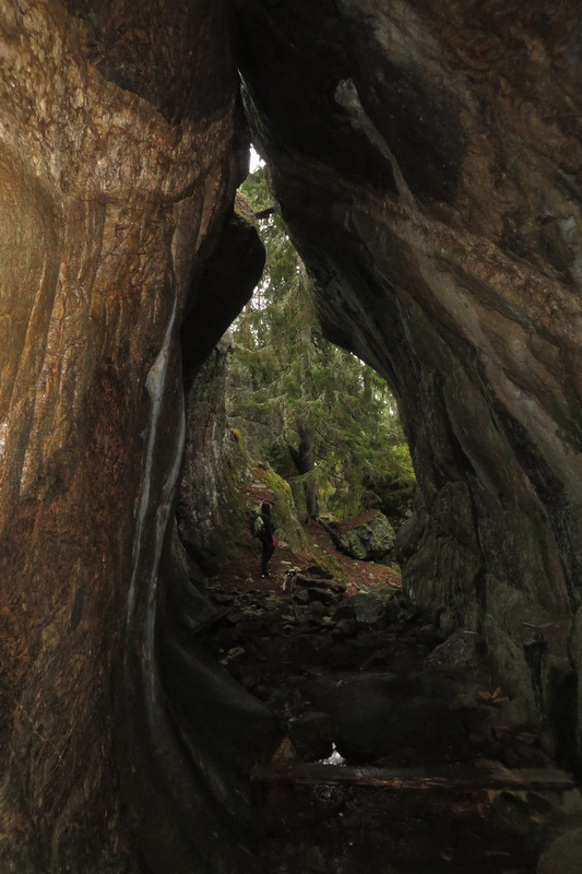 Grottan ligger längs Arnäsleden och bitvis går leden över ett större hygge, men annars är det väldigt mysig terräng med gammal skog och stora stenblock